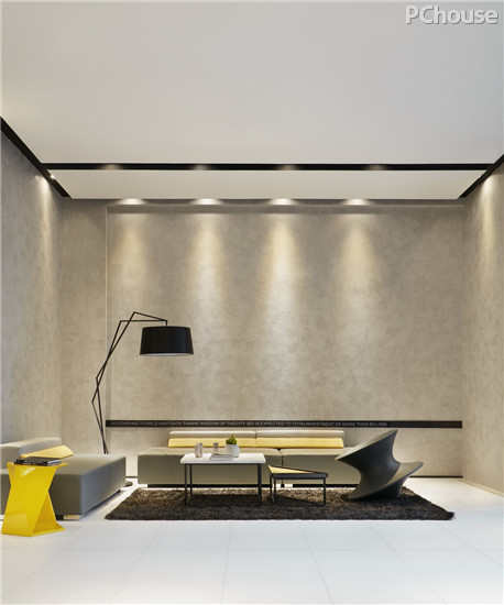 设计说明:不同深浅度的灰色沙发打造出层次感的空间,右侧背景墙以黑底白字设计,营造出时尚的科技感。