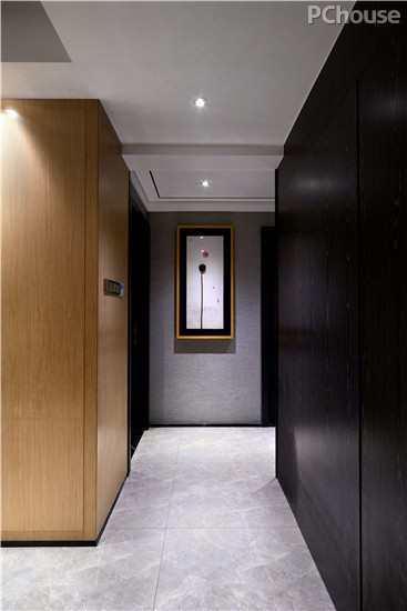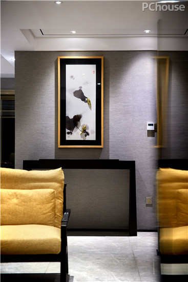 设计说明:玄关处采用传统水墨画加金属边框的混搭,与画中的金色元素相互呼应;公私区域过渡的走廊也有同样的设计手法存在。