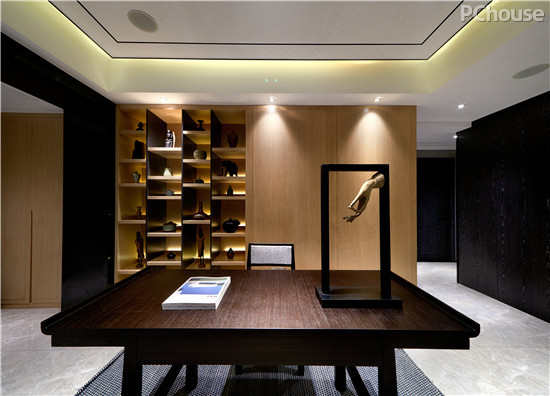 设计说明:书房犹如一个公共空间的过渡,既不浪费又能很好地雕琢出意味来。背景一边用开敞式展览,一边用封闭式增加收纳,黄色皮面在射灯下更有质感。