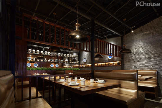 老榆木隔断设计营造出一个能带给食客稳重、质朴空间氛围的工业风餐厅。