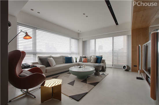 设计说明:格局比例的重建,保留弹性的使用需求,让书房采用半开放式的界定手法,赋予闲适的阅读时光,也让人与人的互动不会因此而阻隔;斜向度的木纹造型拼贴,利用线性增加延展感,背墙的视觉暗角作为大型书籍收纳,让视觉所及的范围维持清爽观感。