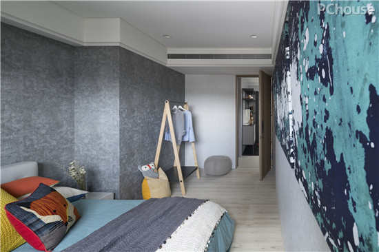 设计说明:次卧室整体风格与主卧室一致,这里的背景墙和床品色调更多了几份活泼的色彩。