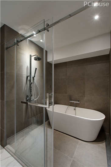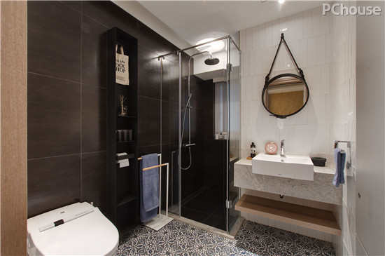 设计说明:淋浴间采用玻璃隔门设计,使得空间更通透明亮,没有局促感;不拘束于收纳的业主采用一面圆形挂镜,达到装饰与实用的双重效果。