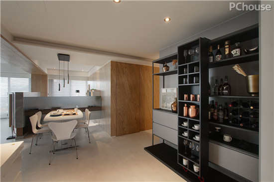 设计说明:餐厅与书房仅一墙之隔,餐柜合作哑黑色材质,以半封闭的形式展现业主的藏品,色调又正好与餐桌椅相反衬。