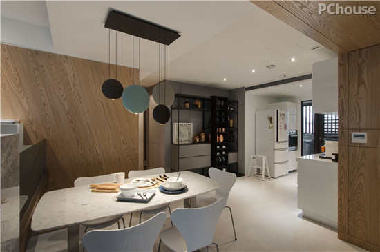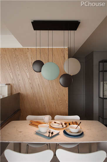 设计说明:餐厅吊灯采用可能的圆形状,高低不一,自由排布,彰显出不拘小节、向往自由的主基调。