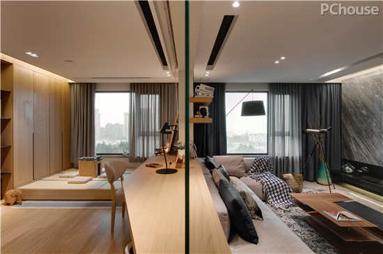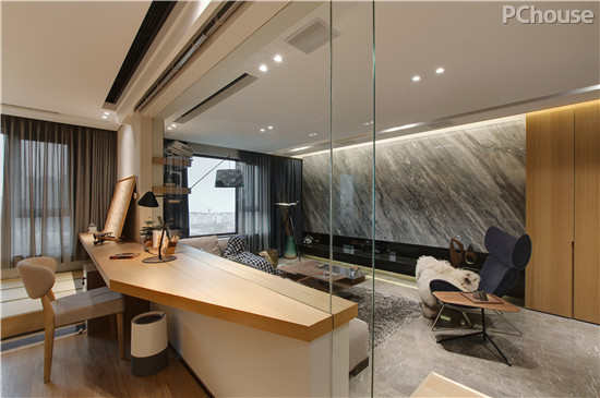 设计说明:紧邻客厅的客房兼书房大胆地使用开放式的玻璃隔间设计,打破公共间与私密空间的僵硬界线,让视线随着阳光遍及之处展开更自由的游移行走。