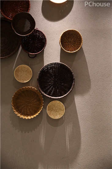 定做的瓷壶吊灯、竹编树叶吊饰、盘子及竹篓装饰等化形于传统生活器皿,在本案中以新的功能意义,融入现代空间装饰之中,烘托出炊烟袅袅的生活场景,打造暗藏趣味细节、让人想一探究竟的用餐空间,为用餐体验增添乐趣。