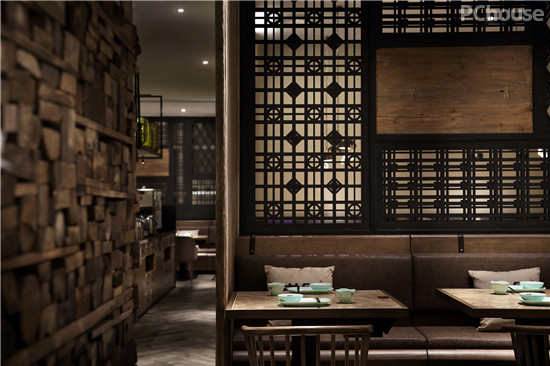 餐厅内部主要通过两种形式的隔断布置空间的层次,一是不同窗棂图案与木板有序组合而成的屏风墙,二是大块老门板充当屏风隔断使用。