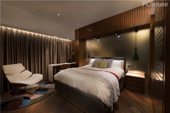 上层的休息区域率先以浅色木地板营造温润自然感,房间木色充斥,辅以变化细腻的灯光效果,铺陈柔和卧眠气氛。