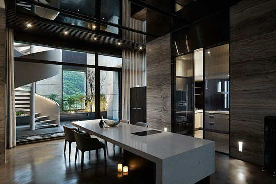 城市风貌与傍山峦景分据视野一方,设计师俞佳宏运用最大限度的以窗框景及镜面反射手法,揽景入室,烘托得天独厚的无价景观。大面积石材肌理展演大宅恢弘气势,灰阶气质与木之温润蔓延整体空间,视听区沙发在刻意下降的地坪自成ㄇ字形聚拢情感,一旁开放式串连的餐厅吧台区则以利落形象表现,勾勒全室时尚而休闲的情境氛围。