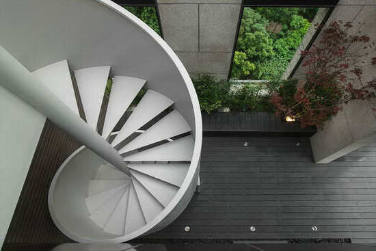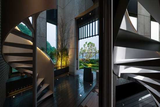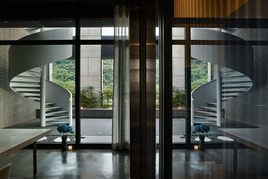 编辑点评:在天、壁巧设大面灰镜,透过映射手法,创造旋转梯于中轴线迭加的视觉特效,形构随角度变幻的虚实意象之美。