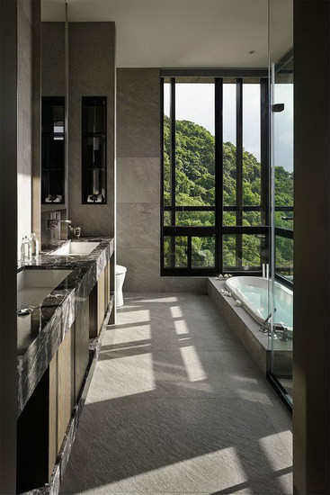 编辑点评:主卧卫浴使用降板浴缸,不牺牲窗外丝毫美景,男女主人可同时使用的大理石材双槽台面,是大宅气势的配备展现。