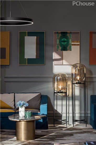 设计说明:色彩成了VIP室的主调,古典样式改造的落地灯和蓝色沙发以非常调和的比例在空间细节中与画面中,形成让人耳目一新的雍容与质感。