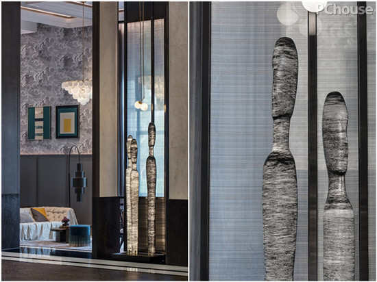 设计说明:VIP室,首先映入眼帘的是来自设计师原创的、全手工打造的艺术装置。象征着神圣的复活节岛Moai以2.5米的高度、抽象艺术的形体和复杂的手工艺,为空间制造戏剧性。
