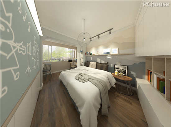 设计构想:以睡眠、储物和办公写作业为主,黑板墙、乒乓球和练习小提琴为辅!利用柜子去做黑板墙和乒乓球桌,在进门的左手边做了一个350㎜的柜子,用立邦随心涂画板漆把乒乓球桌桌面做成黑板墙。