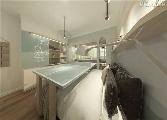 编辑点评:改造的空间,用了浅米色作为空间主色调,整体温馨大气,最大改造难点的乒乓球桌被藏在了床对面的柜子里,不使用时,就作为壁柜的柜门;使用时,往下一拉,就变成了乒乓球桌,重点是这种看似复杂的设计,其实利用普通的五金件就可以完成,并且就连小朋友都可以轻易操作!真正做到运动模式与睡眠模式随意切换无压力!侧面大容量衣柜的设计,也让生活变得更加井然有序。于阳台两头分别设置的工作台,也让父子俩同时工作与学习,互不干扰。