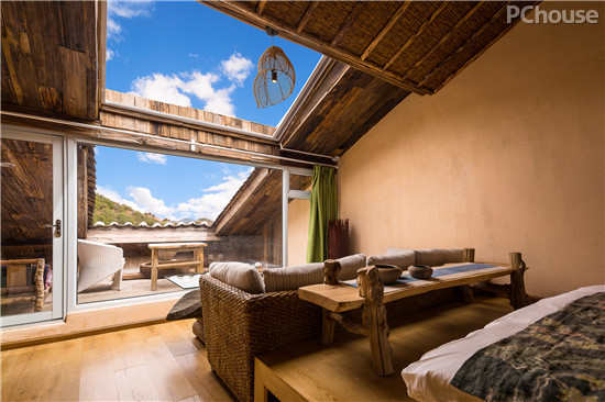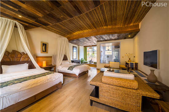 【太平洋家居网 设计频道】风光旖旎的泸沽湖,以其独特的摩挲母系民族文化形成了特殊突出的自然与人文景观,吸引了无数年轻的情侣们在那里写下了一个又一个美好的爱情故事。坐落高原湖泊之间诗莉莉度假酒店,也用美好的居所见证着美好的爱情。这两间酒店从形式上,都采用了当地的材料搭建建筑,使建筑成为自然的一部分,青石板、仿夯土墙、原木、草编、土陶瓦罐……用最质朴打造出最风情。从内容上,则搭配暖光射灯,让一组盆栽,一套茶具,一件睡袍,让空间充满了故事性的叙述意义,最终变成年轻人的蜜月打卡圣地。