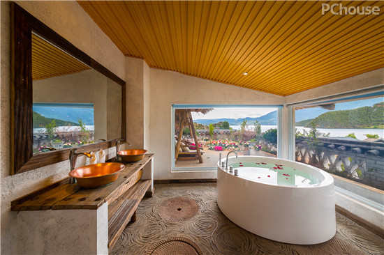 客房装饰均为木制摩挲风格,吊顶运用草席编织工艺,透着古色古香。茶几形象则源自泸沽湖独特的交通工具“猪槽船”,别具民族风情。建筑立面处理引用了框景手法,推窗见湖,如在画中。