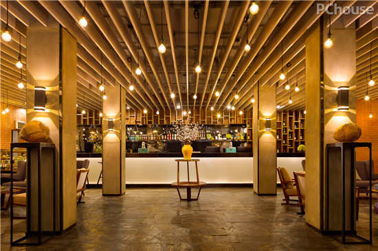 与大堂相连的水吧是项目最有特色之处,水泥装饰柱以黑钢包角,朴实的质感,加上落地玻璃窗,使人置身于户外绝佳景观中,白天可以坐在这里静静地翻一本书,感受静止的时光。傍晚灯光点亮一片璀璨,在悠扬的萨克斯音乐中点一杯酒,极具情调。