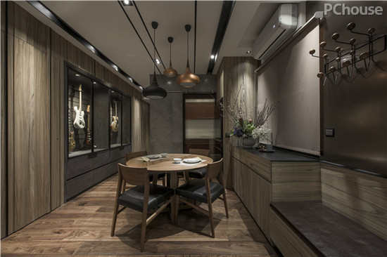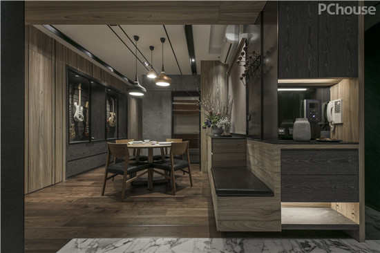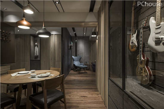 以吉他展示柜做为用餐的背景,让此处成为人们交集对话的中心聚点。