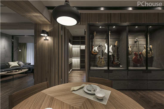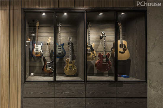 兼具收藏与展示的吉他陈列柜装置除湿控制系统,在潮湿多雨的台北也不怕音色变质,吉他静置于柜内,仍展现出男主人热爱音乐的无比热情。