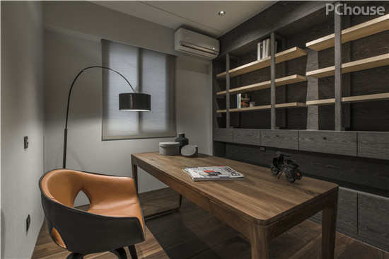 热闹的公共空间接着转往私领域的静谧空间。女主人的书房中整面的大书柜与书桌对望,阅读的场所没有多余的设计装饰,让阅读回归到最纯粹的状态,只要有书本就足以彻夜对谈。