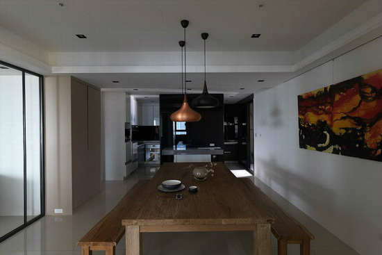 编辑点评:沿用屋主原来使用的餐桌,以取代一般大型中岛,解决空间不足的问题,也创造出流畅循环动线。