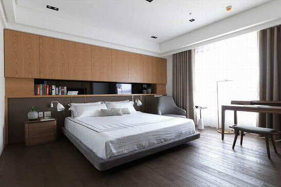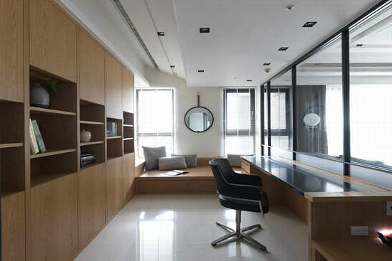 编辑点评:当男主人工作疲累时,卧榻区成为放松休息的地方,还可变成临时客房。木作书桌桌面用镀钛做为线槽,书柜门片采不对称设计,形成错落趣味造型。