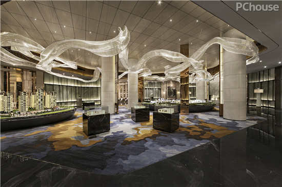 尤其是沙盘区S形大面积的水晶灯蜿蜒盘旋,似行云流水,亦似山脉绵延,风水术语称其“九曲来水位至三公”,是最利财的水相;蓬勃之势,通过阵列、对称、起伏等来增加空间气势感,形成空间独有格局。