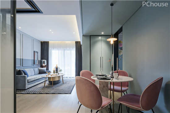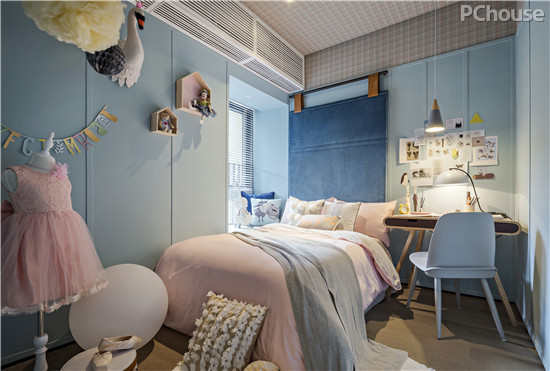 跟公共空间相类似的色彩手法,粉色+蓝色的基调处理,告别过分的性冷淡,是对北欧风格现代化以及人文化的极好处理手法。