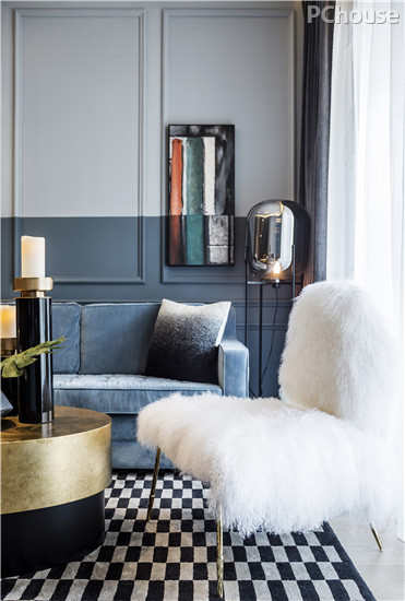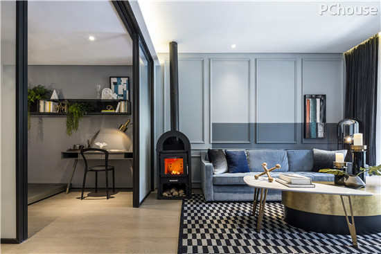 在硬装上的顶、墙、地六个面,不使用纹样和图案装饰,而是使用线条、色块划分不同的功能分区。