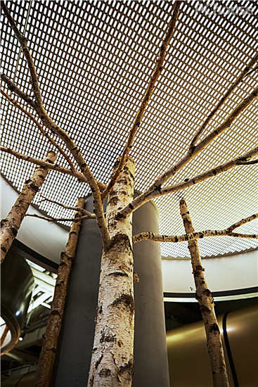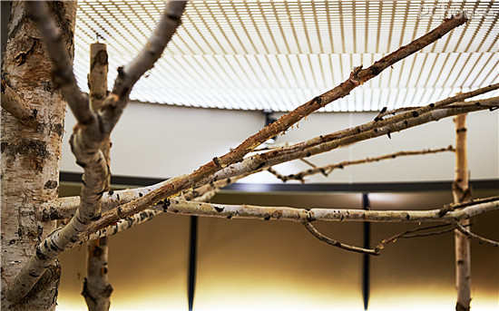 庞大的蒸笼元素造型,以大小不一的形态相组合,作为天花的唯一装饰出现在空间里,与白桦树结合混泥土柱体的默契融合,也是整个空间的视觉焦点。