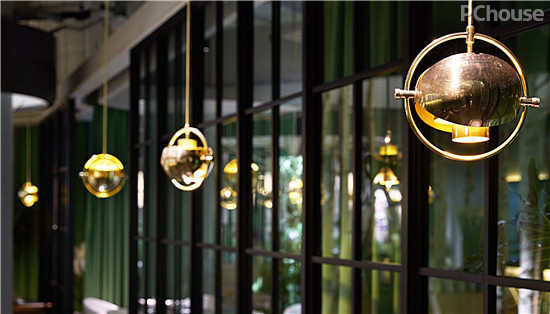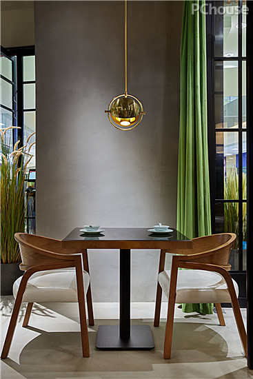 大面积的水泥地面、墙面、丹麦经典的GUBI金属吊灯还原了材料的本质,白桦树作为屏风隐约地将餐厅分割成了几个区域。