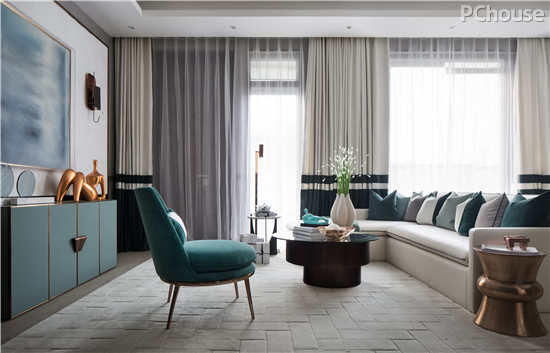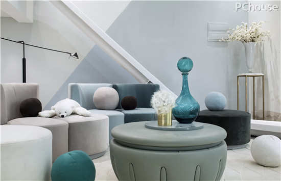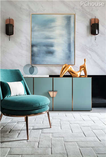 客厅设计中,乐尚设计通过采撷冰灰、松石绿、青灰绿,并不断的调节他们的饱和度,来达到空间色彩层次的丰富度。