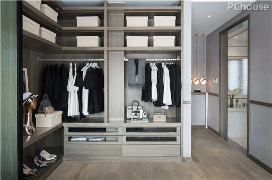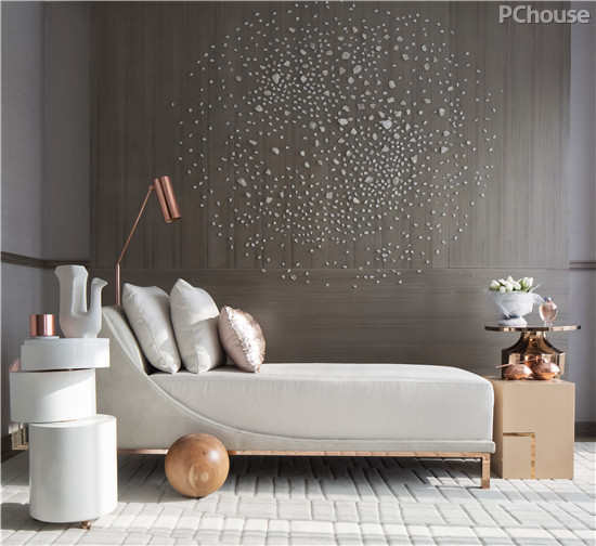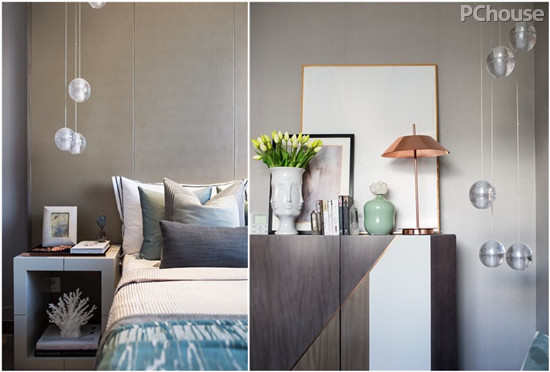 主卧舒怡的视觉呈现,足以在第一眼捕获人的欢心。纤维植物的曲线、矿物沉淀的肌理、海水流动的幻影、孩子般快乐的幽默美学,于此皆成设计的因由。米灰白和暖灰奠定了整个空间清新干净的基调,浅玫瑰金提升了空间明度,自带时尚优雅。
