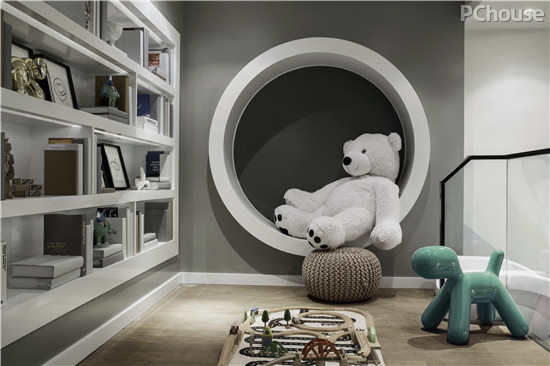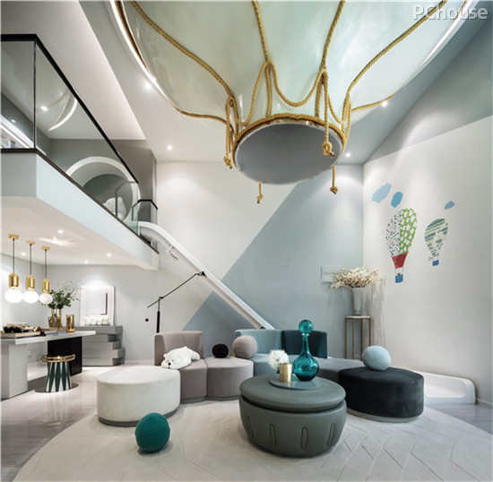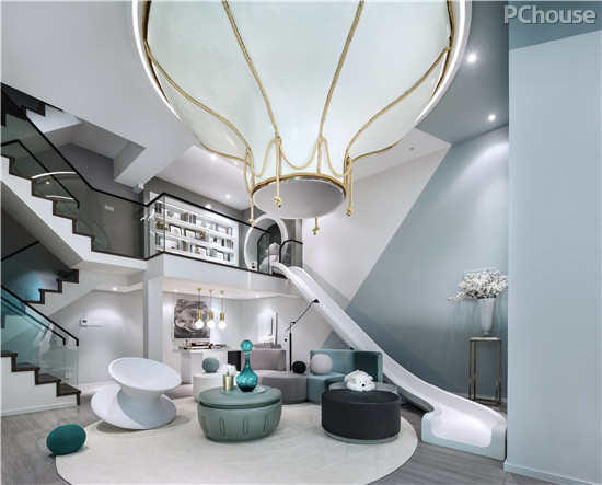 地下室完全打造成孩子们玩乐的疯狂世界,墙内嵌入的环形座椅、白色的巨型陀螺、可以从夹层滑下的滑梯,大大的热气球吊灯,无不承载着孩子们的美梦和欢笑。当然,每个大人曾经都是孩子,这里也是家人相聚时最放松、最温馨的角落。