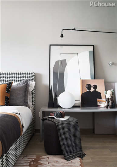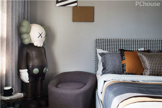 隔壁的男孩房带有一丝英伦风,融入气质格纹和牛皮色,酷酷的风格让我们想见小主人的十足个性。但是伫立床边的玩偶形象,似沉思、似叛逆、似向往,又凸显了孩子调皮淘气的另一面。