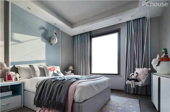 灰蓝色的公主房,甜美又不失坚强,不管是像小蛋糕一样的座椅,还是天空中漂浮的白云吊灯,每一种都在宣示着小公主可爱的领地。