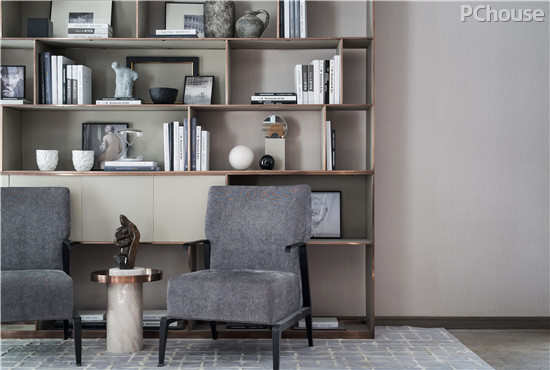 整个双层挑高空间都是主人的藏书室,自由游走在细腻与粗犷、现实与理念之间,是整个居室的精神高地,配备有精良的沙发、躺椅等,亦可作为次客厅使用。