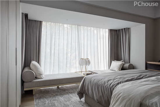 为了给空间带来通透的视觉感受,设计师运用了大量整面玻璃,绿意从屋内延伸到屋外,模糊了家与自然的界限,足不出户宛如置身森林。主卧延续了节制的灰色调,凸显艺术品和墙上画作的性格。
