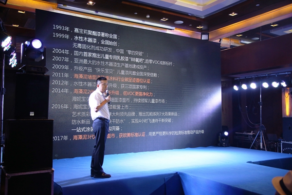 嘉宝莉集团家装漆事业部副总经理罗志清在发布会上致辞。他表示,海藻泥系列是嘉宝莉内墙漆产品家族的明星和名片,代表了嘉宝莉内墙漆最严格的环保标准和最顶尖的配方技术,与原装进口涂料产品相比,海藻泥3代墙面漆在环保性能和产品品质方面毫不逊色,在某些方面还更胜一筹。产品通过了最严苛的美国UL GREENGUARD绿色卫士金级认证和法国A+空气质量认证,就是最好的证明。之所以把首场海藻泥3代上市发布会定在温州,一来是看中这里的消费力和对环保产品的高需求,而作为乳胶漆系列里面的最高端产品,海藻泥3代的优异性能也能从容应对这里复杂的气候环境,经得起市场考验。
