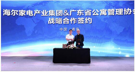 (图片说明:海尔家电产业集团大客户总经理刘刚与广东省公寓管理协会会长刘昕签署战略合作协议)