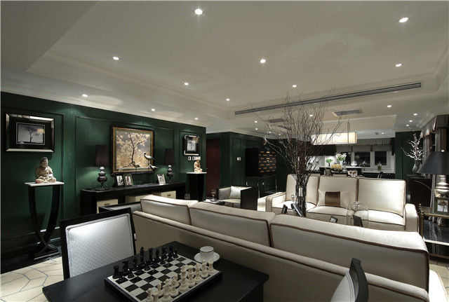在设计中大范围的黑、白、咖与雅致的灰绿相搭配,配以简洁造型的家具,东方韵味的色彩搭配展现了低调、大气。在不同空间,色调也有不同层次的变化。以温和的色系强调温馨的归属感,沉稳的大理石与硬朗格栅之余,温润的木材丰富了细节,随动线发展衍生出变化。