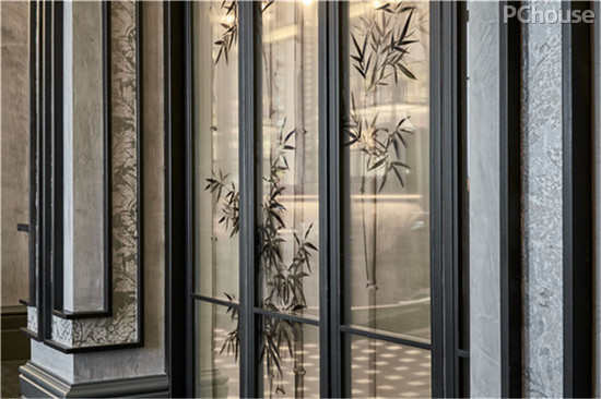 进入餐厅,传统中国风的梅花图案玻璃屏风分外夺目。中式的屏风悬挂在正面两个西方的科林斯柱中央,将两个世界融为一体,也表达着这个空间的特殊之处,引领著客人逐步踏入一段历史文化之旅。屏风上的梅花作为入口的焦点亦在展现古典气质的同时,也因为其运用现代的制作技术表现,赋予了整个入口视觉时空交错的第一印象。