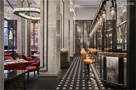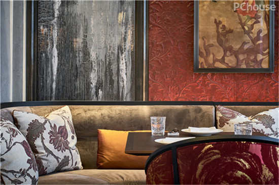 为了尽可能保持历史建物的完整,所有的金属外框皆是以沿著原始柱子以及墙面结构额外打造出,另外特殊订制而成的吊顶置架。中央用餐区以及沙发区的照明更是考虑历史建筑中不应该出现过度现代化的投射灯后而另外特殊定制出符合历史样貌的照明,并与在用餐区的椅子和沙发的丰满红色相呼应 。