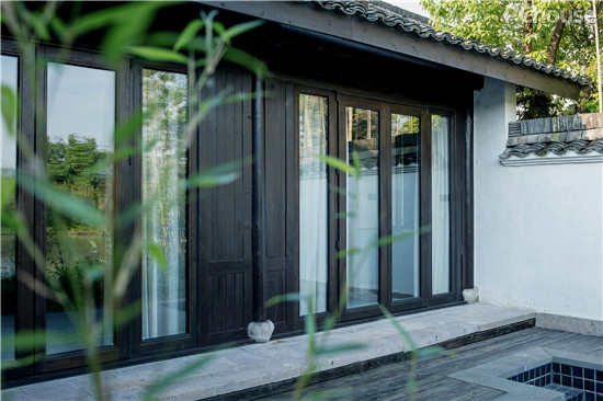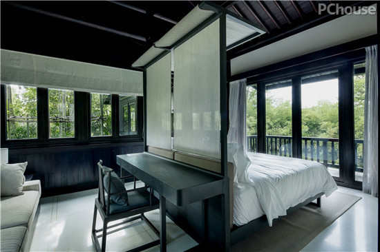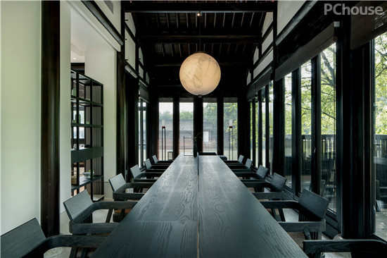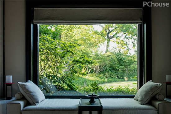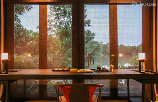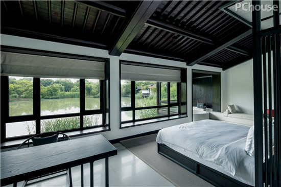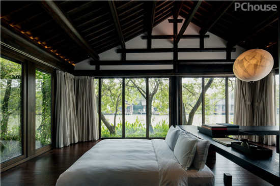 在室内外关系的处理上,着重表达与风景的融合、与水系的融入。窗,成为重要的媒介。传统中式的建筑,注重隐、闭,惯以镂空的窗格采光。在张炜伦的设计视角中,当代的中式建筑,不应因循守旧,应当传递当代的居住精神,让天光水色,满盈室内,无处不在。