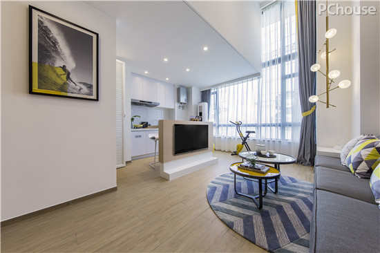 客厅空间采用挑高设计,电视墙与吧台合二为一,吧背面则是开放式厨房,这样的布局既适合年轻人轻食化的烹饪习惯,也可以将空间感扩大。
