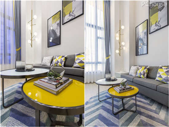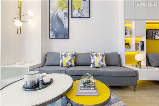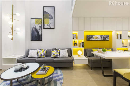 明黄色调的应用贯穿到整个客餐厅,简单的双圆形茶几也由明黄色+灰白色组成,加上精心挑选的抱枕,整个空间视觉色彩统一。
