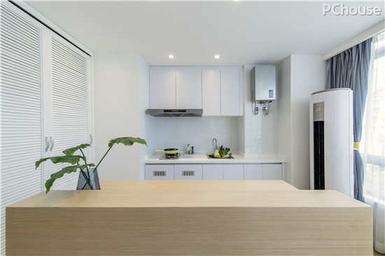 电视墙背面的吧台采用浅浅的原木色设计,坐在上面,可以轻松地与客厅的空间对视交流,吧的背面则是以轻食为主的小厨房,把收纳做得极致,毫不凌乱。