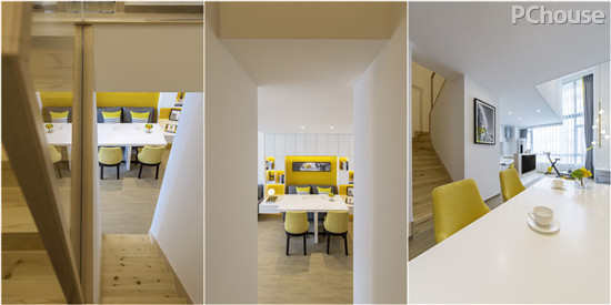 餐厅的背面是转向二层的楼梯,从楼梯间往下看,又能窥视餐厅的明亮色彩,空间转承一气呵成。